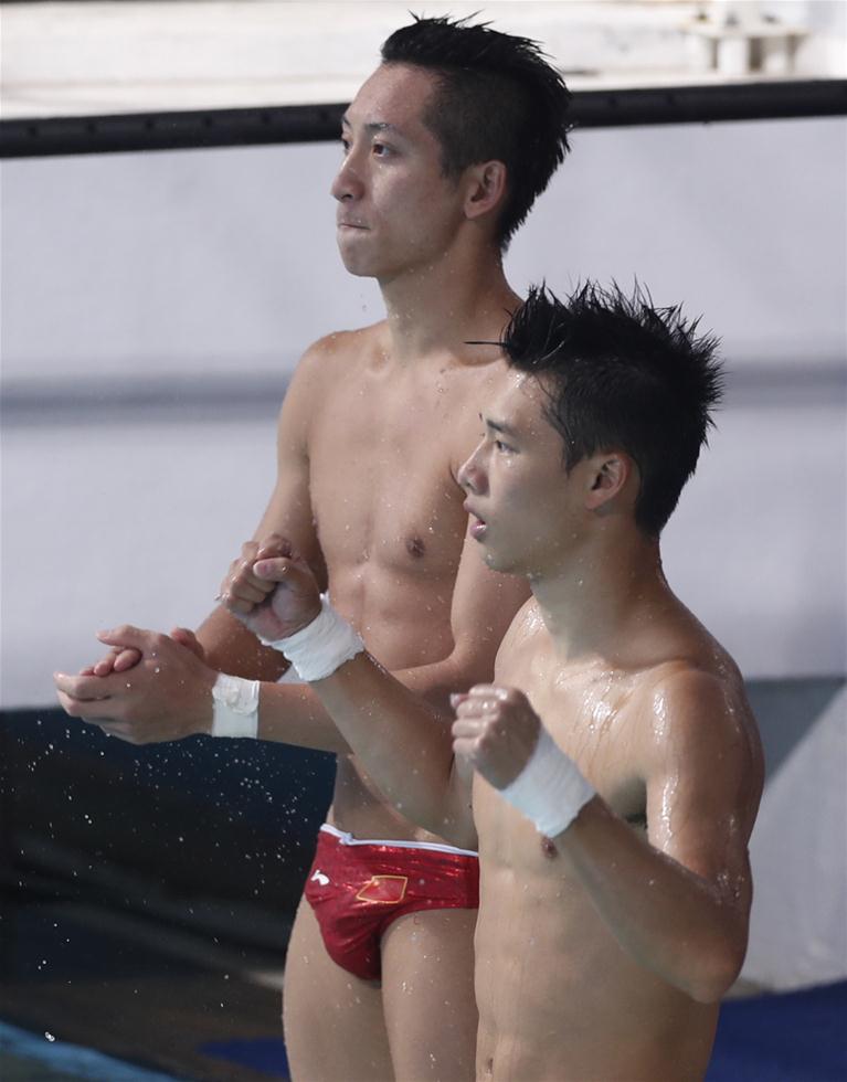8月8日,林跃(左)/陈艾森在比赛中。当日,在2016年里约奥运会男子双人十米台决赛中,中国组合林跃/陈艾森以496.98分的总成绩夺冠。 新华社记者曹灿摄