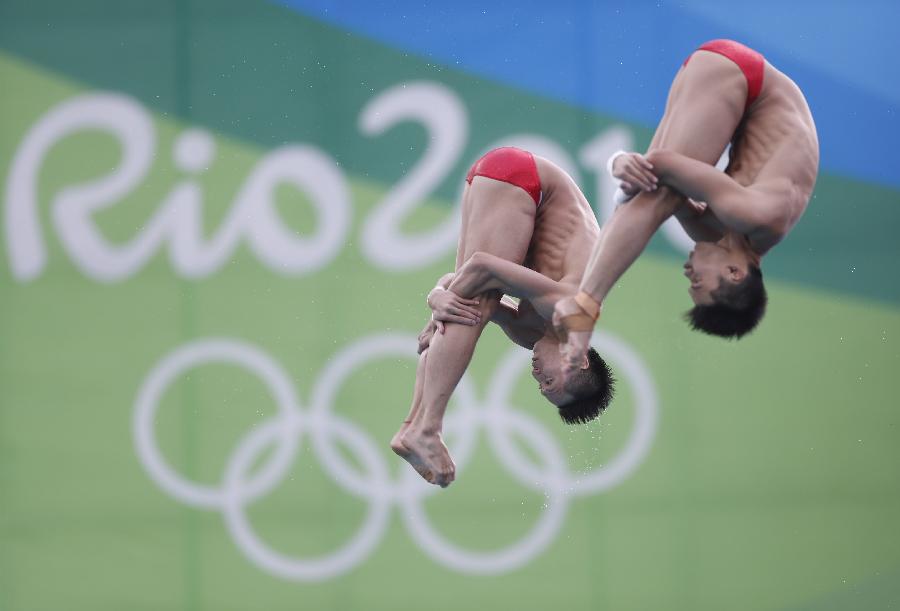 8月8日,林跃(左)/陈艾森在比赛中。当日,在2016年里约奥运会男子双人十米台决赛中,中国组合林跃/陈艾森以496.98分的总成绩夺冠。 新华社记者费茂华摄