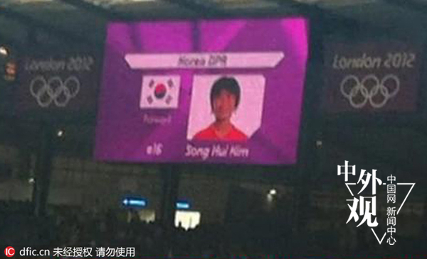 同样是在伦敦奥运会上,在朝鲜女足与哥伦比亚队比赛前,球场中央的大屏幕介绍朝鲜女足队员的头像旁显示的却是韩国国旗,朝鲜女足队员一度集体离场以示抗议。伦敦奥组委事后公开致歉并保证此类错误绝不再犯。