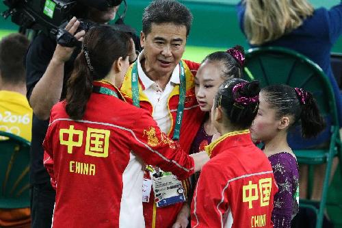 8月9日,中国队教练王群策(左二)安慰在自由体操项目比赛中失误的队员毛艺。 新华社记者郑焕松摄