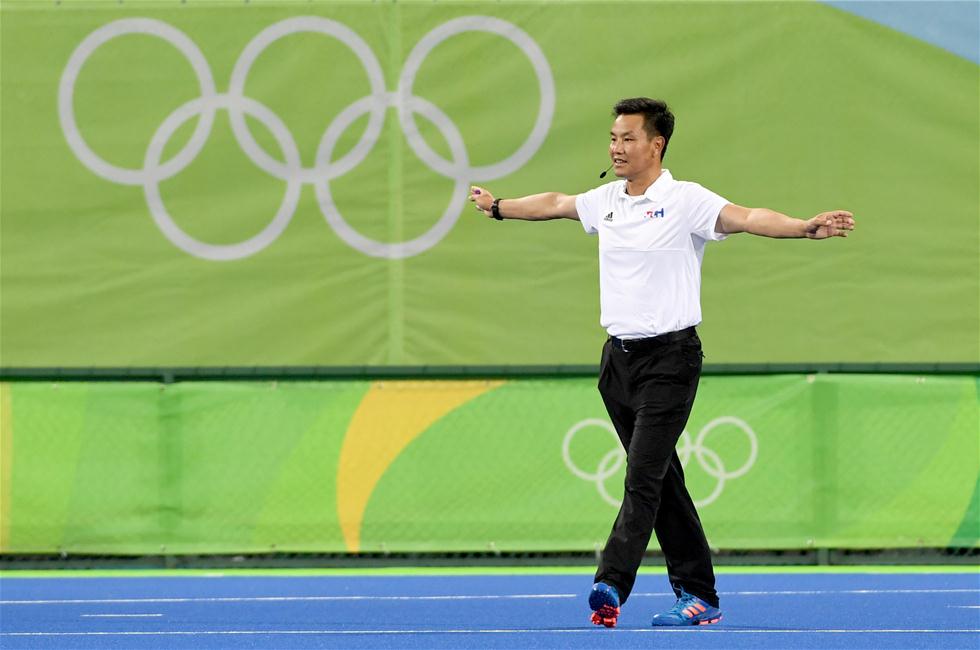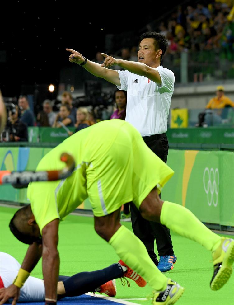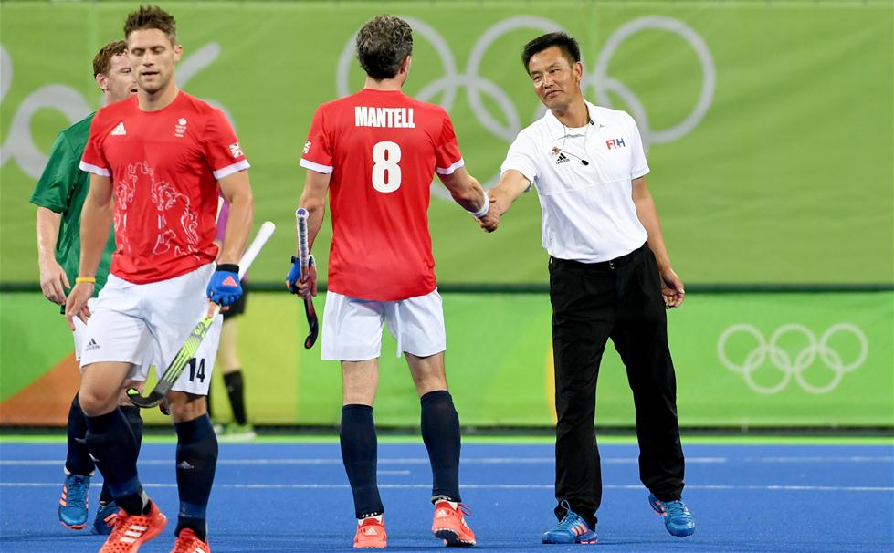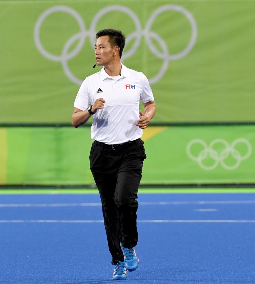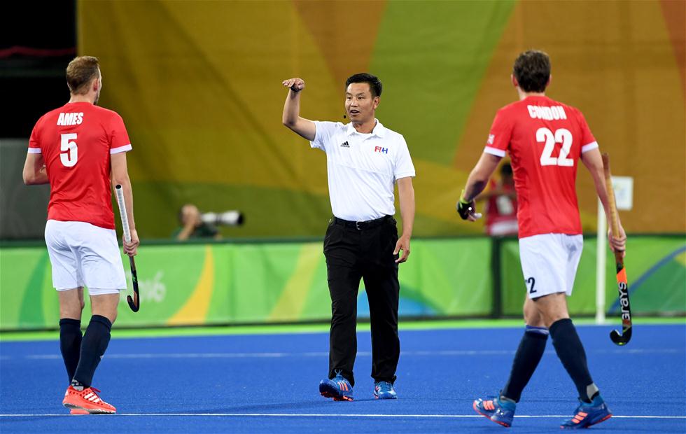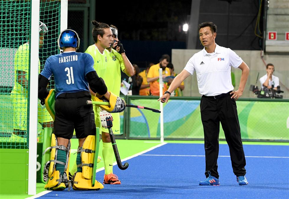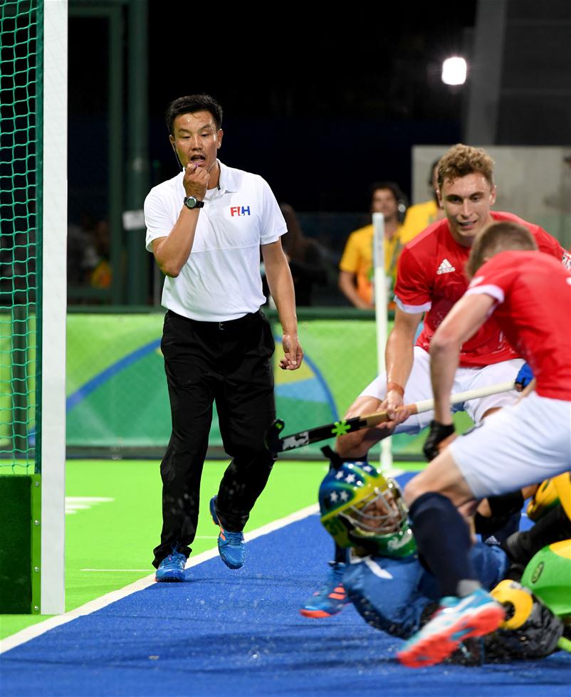 8月9日,裁判陈德康在比赛中执法。当日,来自中国江苏省的裁判陈德康亮相里约奥运会曲棍球赛场,执法了男子小组赛英国队与巴西队的比赛,陈德康也因此成为中国首位执法奥运会曲棍球比赛的男裁判。今年44岁的陈德康在国内从事曲棍球教练工作,曾获得奥林匹克级曲棍球裁判证书。新华社记者王毓国摄