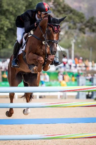 8月9日,华天在比赛中。当日,中国骑手华天参加2016年里约奥运会马术个人场地障碍赛。 新华社记者刘彬摄