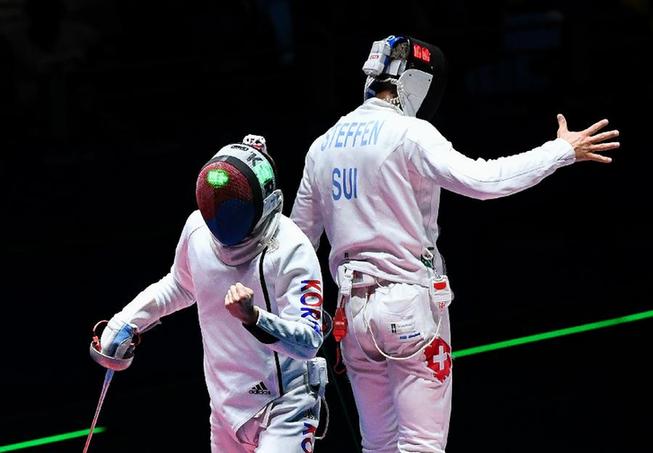 8月9日,韩国选手朴尚永(左)与瑞士选手斯特芬在半决赛中。当日,在2016里约奥运会男子重剑个人赛半决赛中,韩国选手朴尚永以15比9战胜瑞士选手斯特芬,晋级决赛。 新华社记者刘大伟摄
