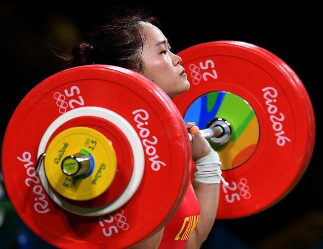 8月9日,邓薇在比赛中。当日,在里约奥运会女子举重63公斤级决赛中,中国选手邓薇以262公斤的总成绩夺冠,并打破挺举和总成绩两项世界纪录。 新华社记者 程敏摄
